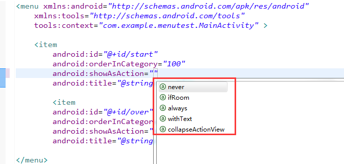 <item>元素除了常规的id、icon、title属性的支持,还有一个重要的属性:android:showAsAction,这个属性是起兼容性的,描述了在Android的高版本中,菜单项何时以何种方式加入到ActionBar中。