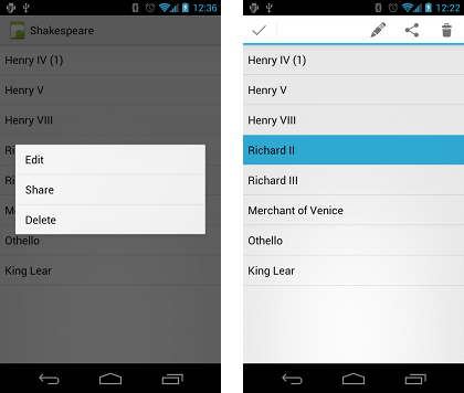 - ContextMenu和ActionMode:ContextMenu是一个浮动的窗口形式展现一个选项列表,ActionMode是一个显示在屏幕顶部的操作栏,允许用户选择多个选项,ActionMode在Android3.0之后才有支持。