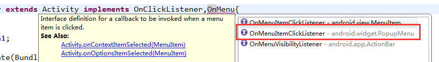 注意14行代码绑定了两个监听器:OnClickListener和OnMenuItemClickListener。 在绑定OnMenuItemClickListener监听器时,选的是下面这个: