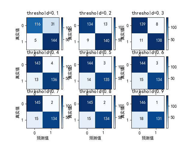 但是predict()的结果非0即1,因为给出了一个阈值。默认是0.5, 超过0.5则认为是1,小于0.5则认为是0如果根据不同的阈值绘制混淆矩阵,如下: