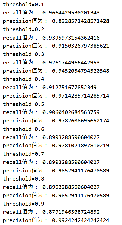 设置不同阈值时,对应的召回率recall和精确率precision