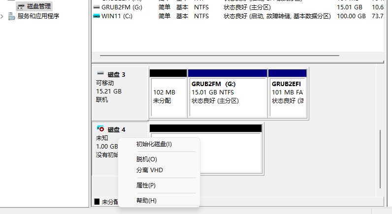 点击确定就会创建虚拟硬盘,下面就是挂载我们创建的虚拟硬盘:在磁盘管理找到你刚刚创建的虚拟硬盘: