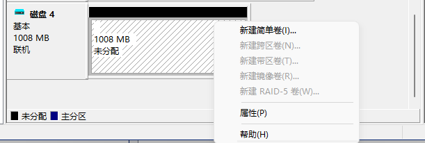 点击确定,然后右击黑色位置那里,选择新建简单卷: